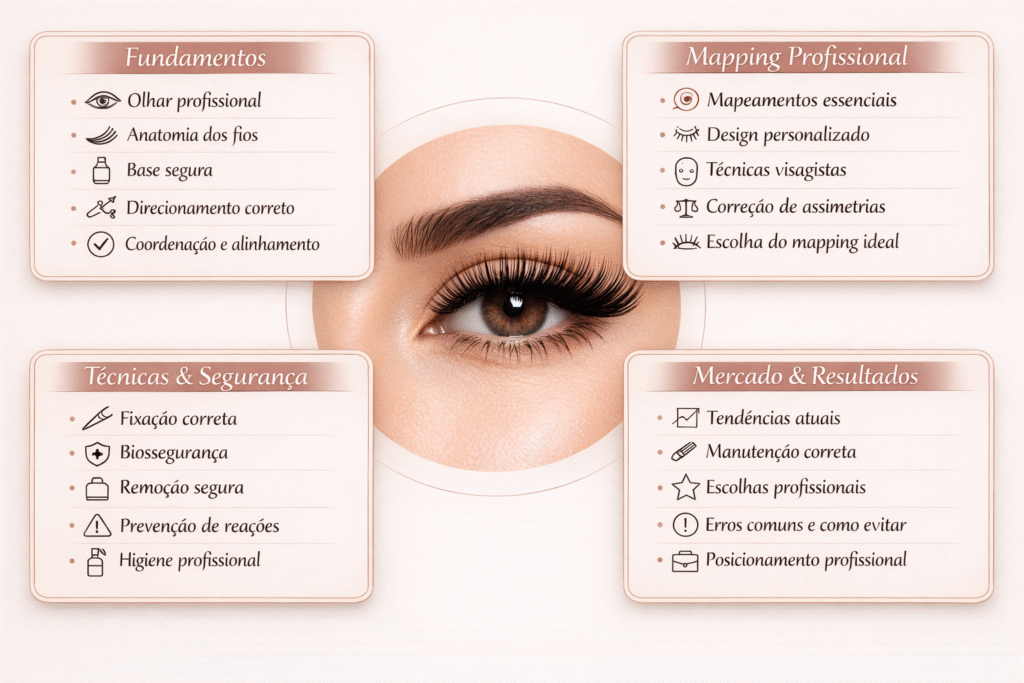 ✔ Mapeamentos profissionais: aprenda os estilos mais usados pelas lash designers de destaque.